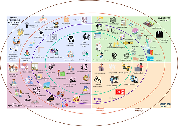 My team and I translated our gathered data into user personas to grasp the unique challenges, needs, and goals of participants. With these insights, we convened a diverse group of stakeholders—individuals with lived experiences, case managers, program managers from homeless shelters, funders, and policymakers. Together, we ideated on four broad categories essential for designing the ecosystem map of the refettorio: